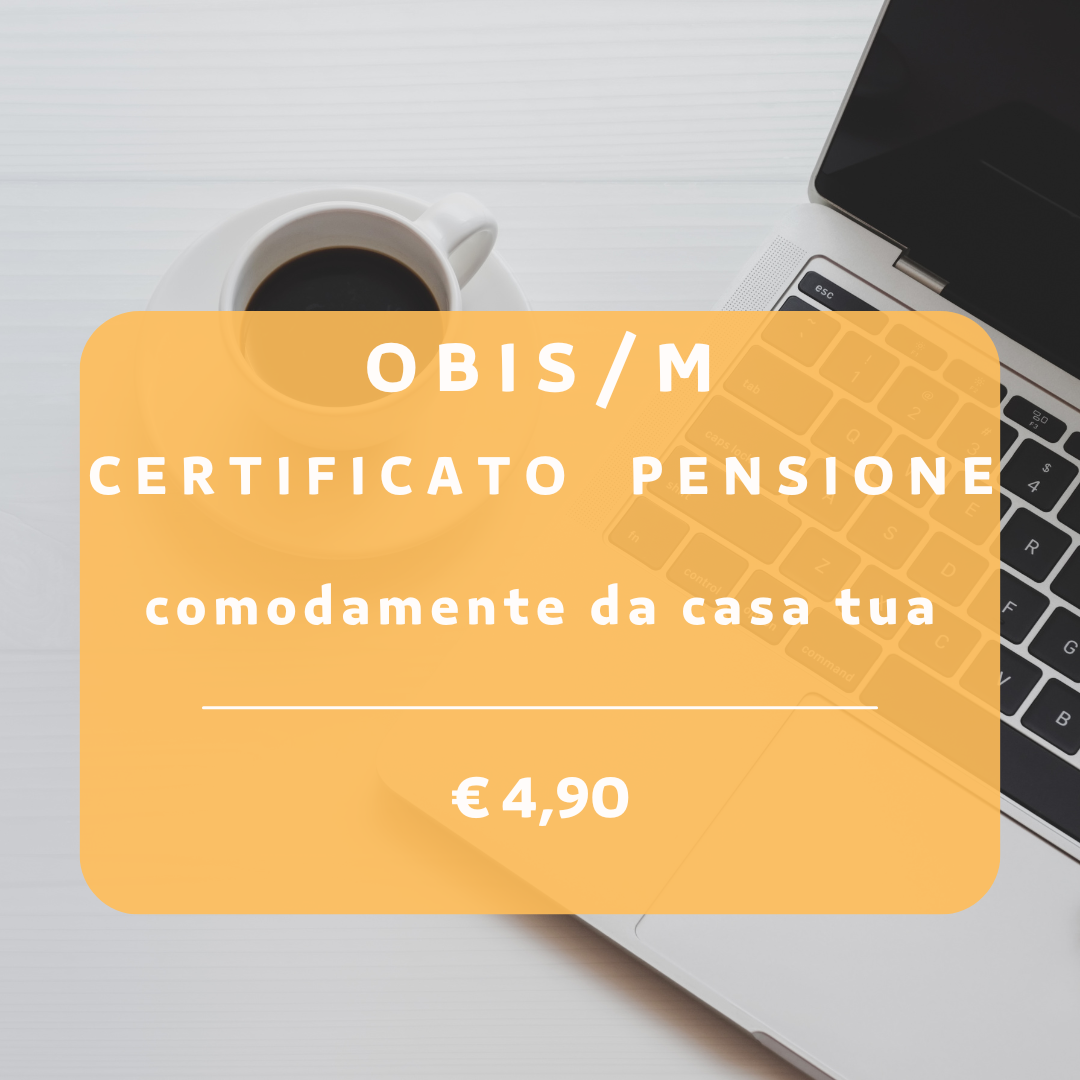 Novità! puoi inviarci la pratica comodamente da casa, senza recarti nei nosri uffici. Il certificato di pensione (Modello ObisM)Nel certificato di pensione (modello ObisM) sono riportati i dati anagrafici del pensionato, la sede INPS di gestione, la categoria e il numero di certificato. Ogni anno l'INPS rilascia al pensionato il certificato di pensione (modello ObisM) che riassume le principali informazioni delle pensioni INPS che sono in pagamento, quali ad esempio: